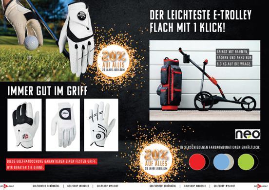 Profitieren Sie vom 1. bis 31. Mai 2022 von 20% Rabatt auf ausgewählte Handschuhe sowie NEO Elektro Golf Trolleys. (Flyer […]