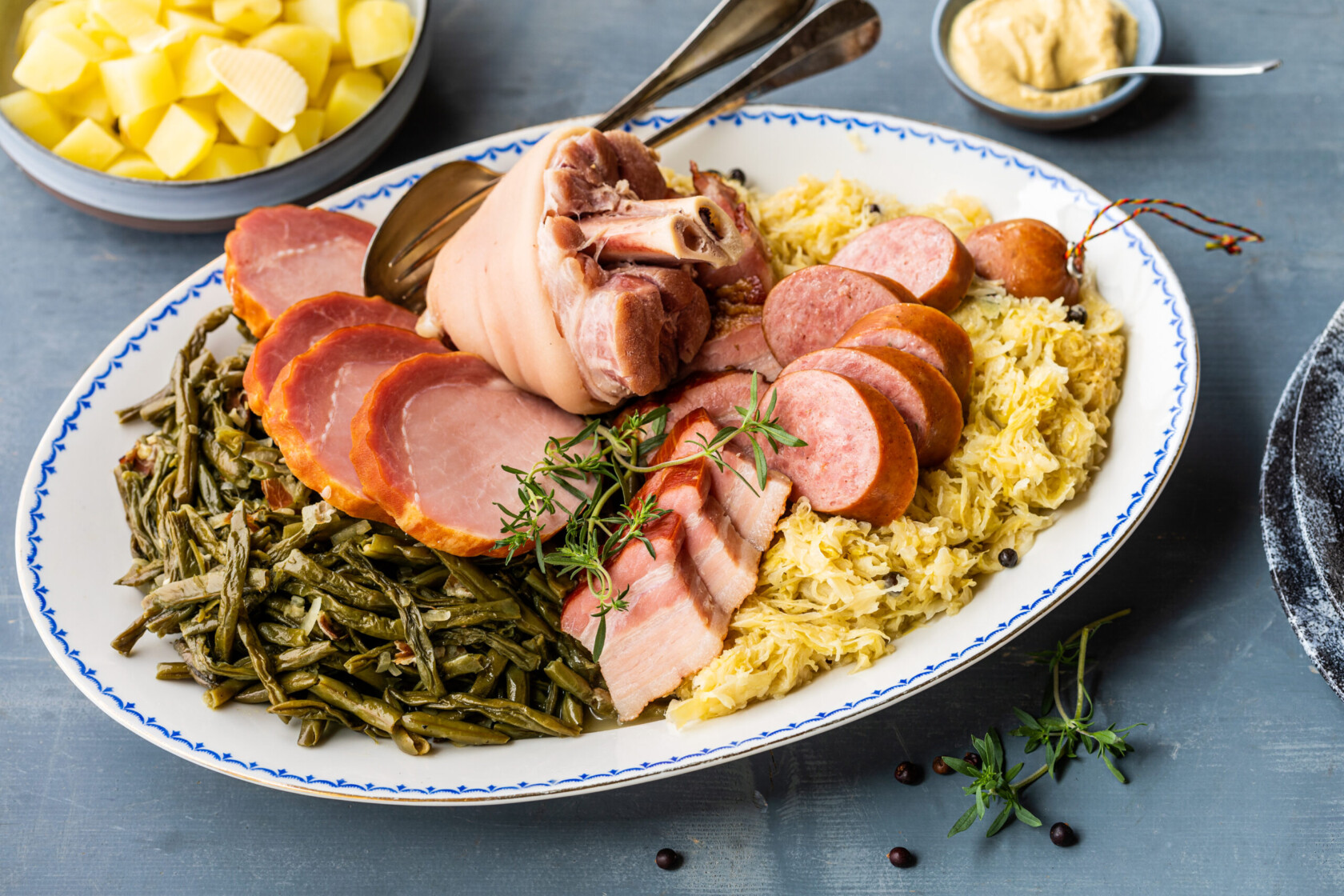mit Sauerkraut, Dörrbohnen und Salzkartoffeln,